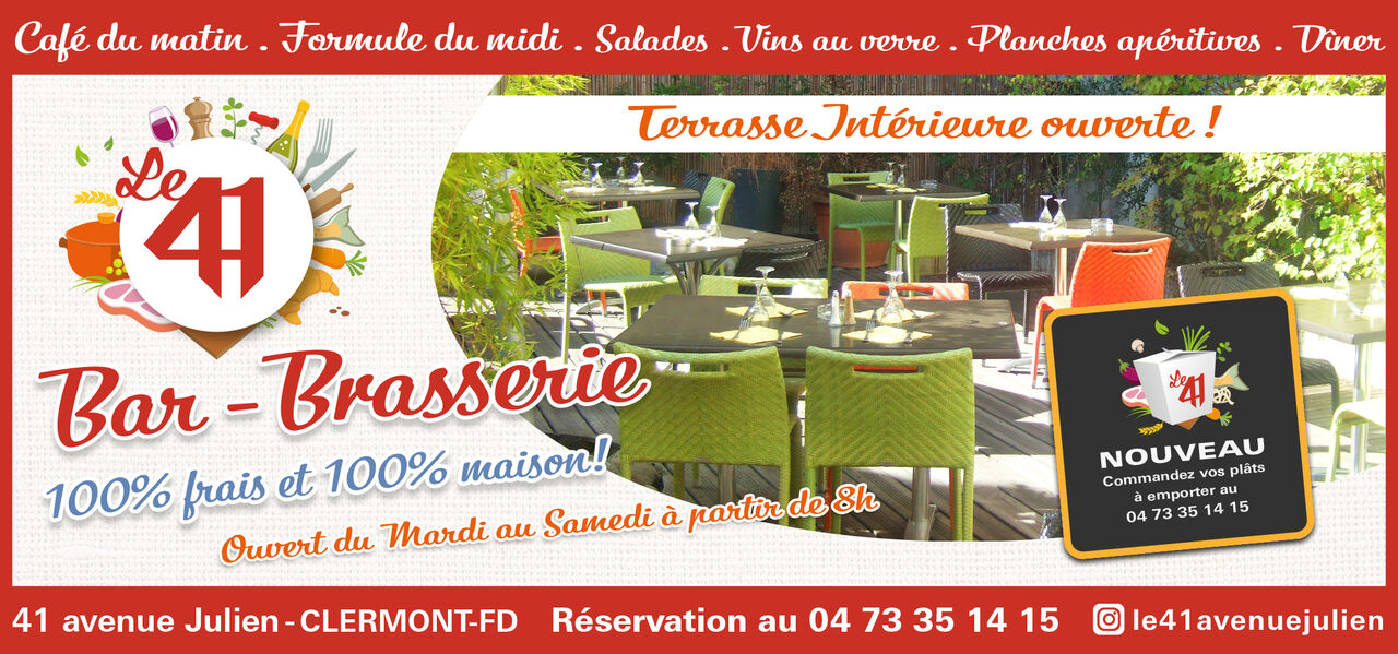 Il doit son nom à un numéro de rue (ou d’avenue, plus précisément ;) mais aussi à une durée de trajet… A seulement 4 minutes et 10 secondes à pied de la place de jaude ou du cœur de ville de Chamalières, le 41 est un bar brasserie aux airs chantant, où l’on aime se la couler douce. Pour un café matinal, un déjeuner ou un dîner aux saveurs franco-italiennes ! A chaque moment de la journée, cette adresse atypique cache un joli trésor : une grande terrasse en cours intérieure, à l’abri des regards indiscrets et des bruits de la ville !